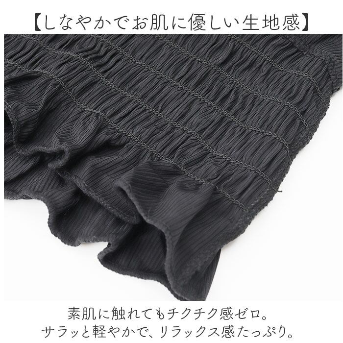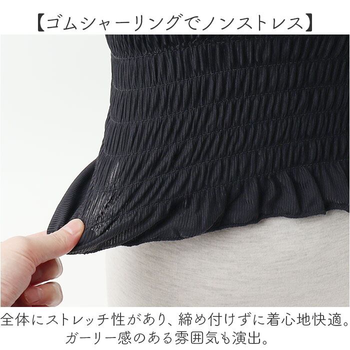 ・全体にストレッチ性があり、締め付けずに着心地快適。ガーリー感のある雰囲気も演出。