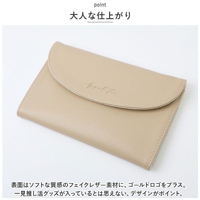 ・表面はソフトな質感のフェイクレザー素材に、ゴールドロゴをプラス。一見推し活グッズが入っているとは思えない、デザインがポイント。
