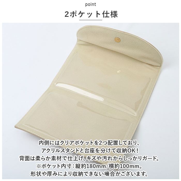 ・内側にはクリアポケットを2つ配置しており、アクリルスタンドと台座を分けて収納OK!背面は柔らか素材で仕上げ、キズや汚れからしっかりガード。(※ポケット内寸:縦約180mm/横約100mm。形状や厚みにより収納できない場合がございます。)