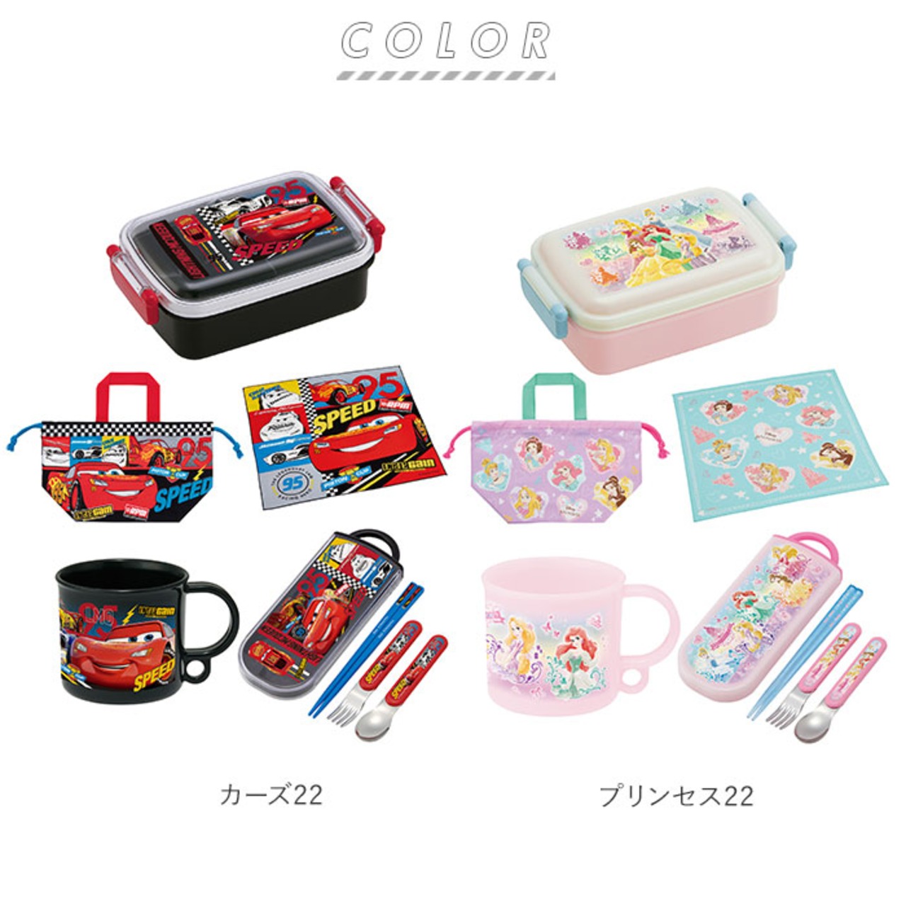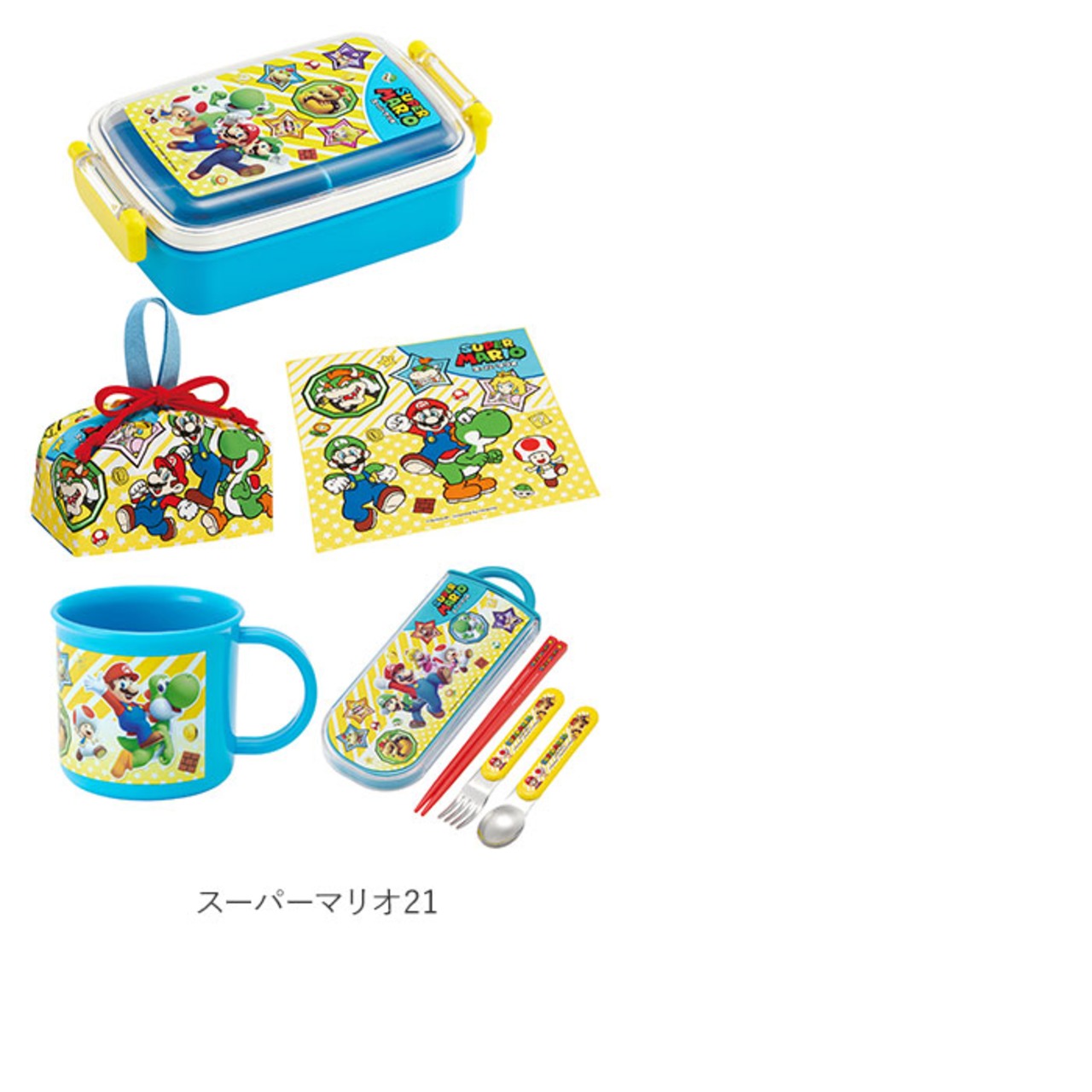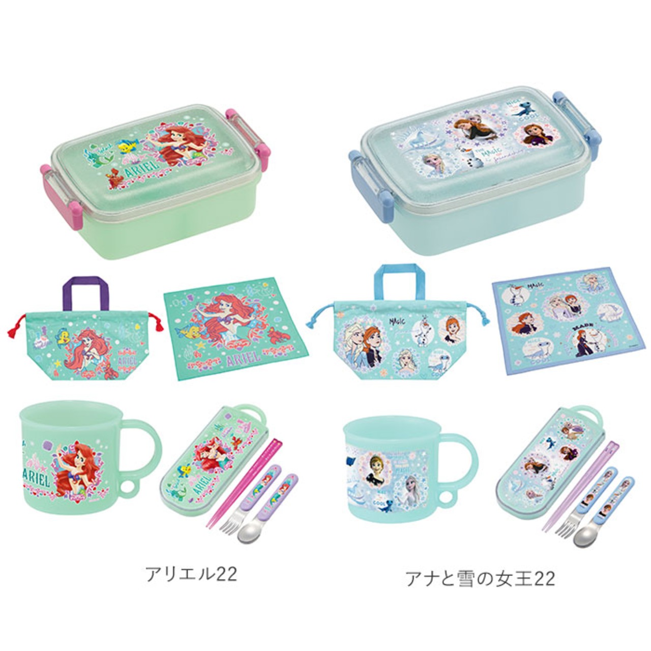 ・人気キャラクターの絵柄がかわいい!タイトランチボックス・トリオセット・プラコップ・ランチ巾着・ランチクロスの5点セット。