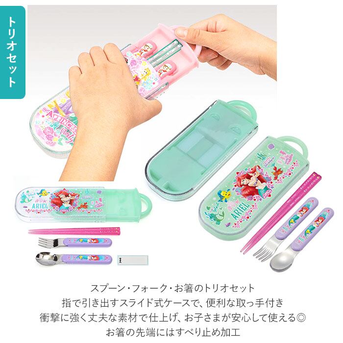・スプーン・フォーク・お箸のトリオセット。本体と中皿を一体化し、コンパクトかつ軽量で洗いやすさもポイント。