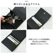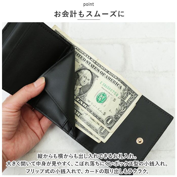 ・縦からも横からも出し入れできるお札入れ。大きく開いて中身が見やすく、こぼれ落ちにくいボックス型の小銭入れ。フリップ式の小銭入れで、カードの取り出しもラクラク。