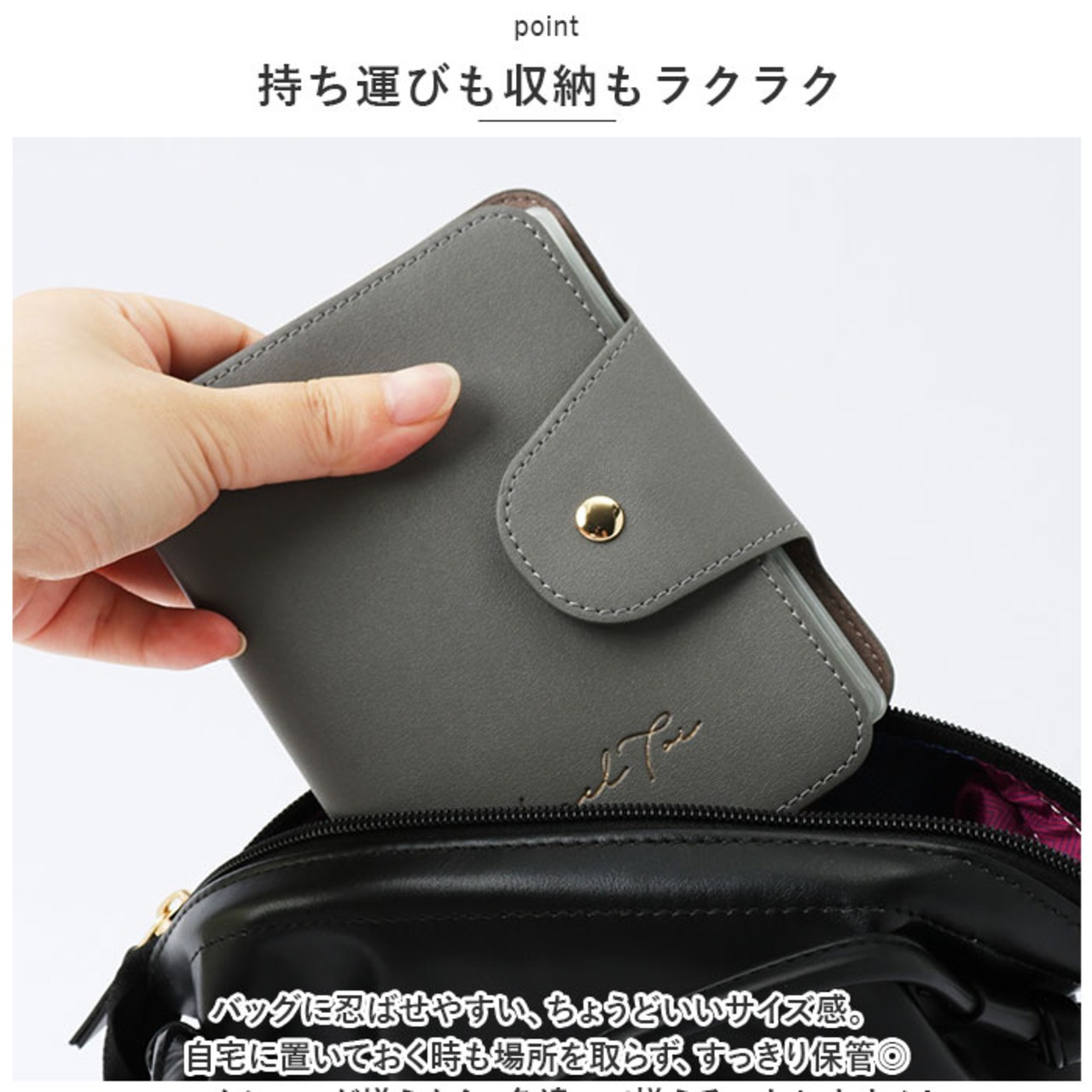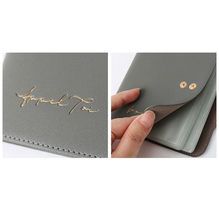 ・表面はソフトな質感のフェイクレザー素材に、ゴールドロゴをプラス。一見推し活グッズが入っているとは思えない、デザインがポイント。