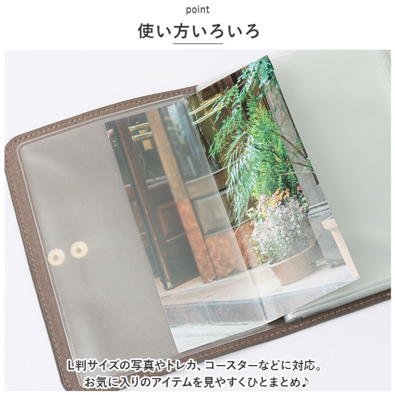 ・L判サイズの写真やトレカ、コースターなどに対応。お気に入りのアイテムを見やすくひとまとめ♪