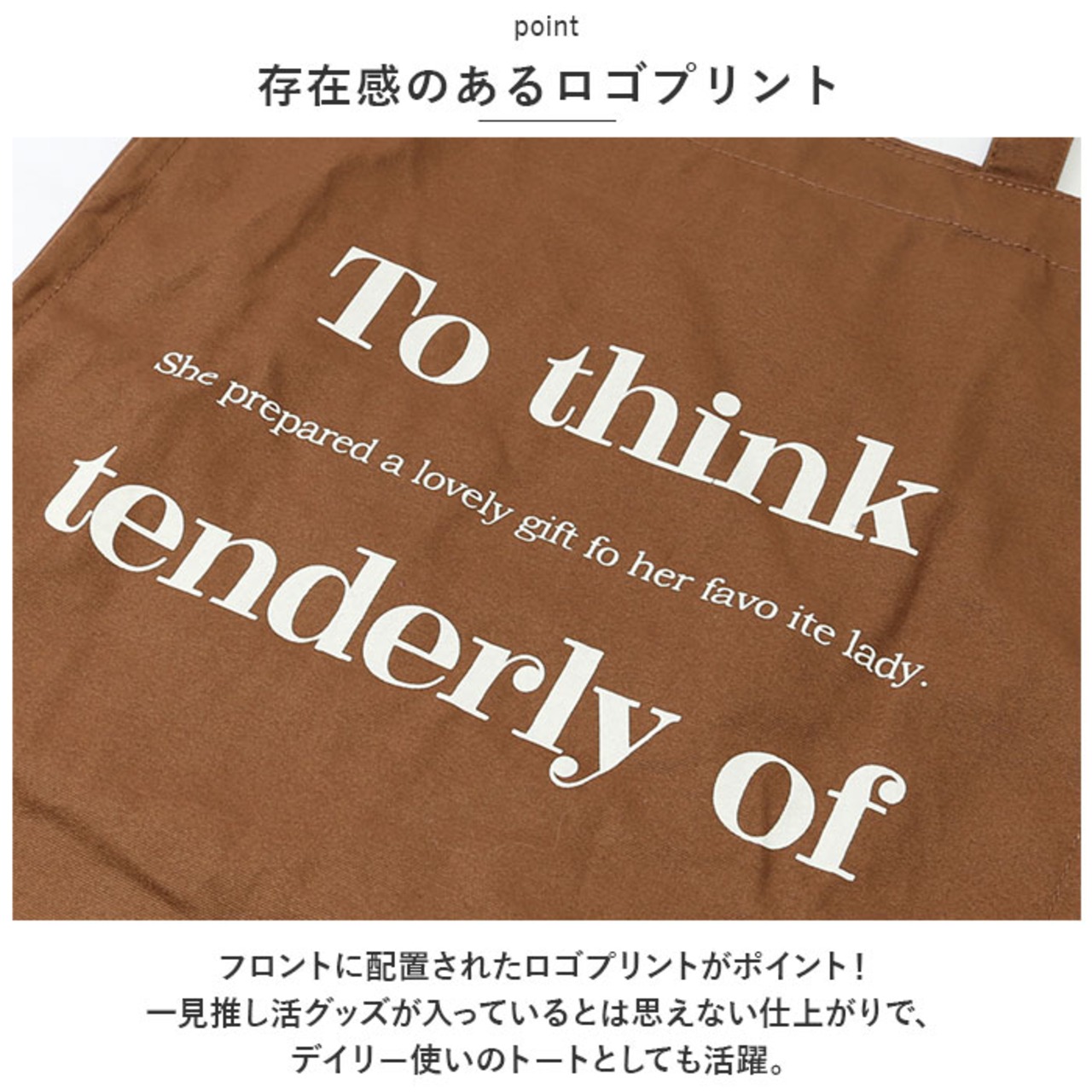 ・フロントに配置されたロゴ刺繍がポイント!一見推し活グッズが入っているとは思えない仕上がりで、デイリー使いのトートとしても活躍。