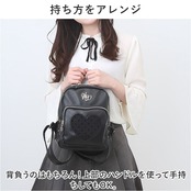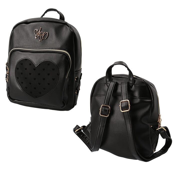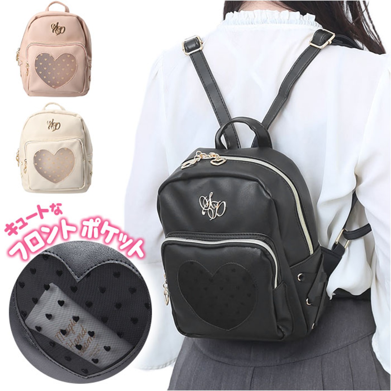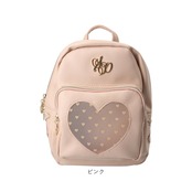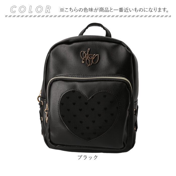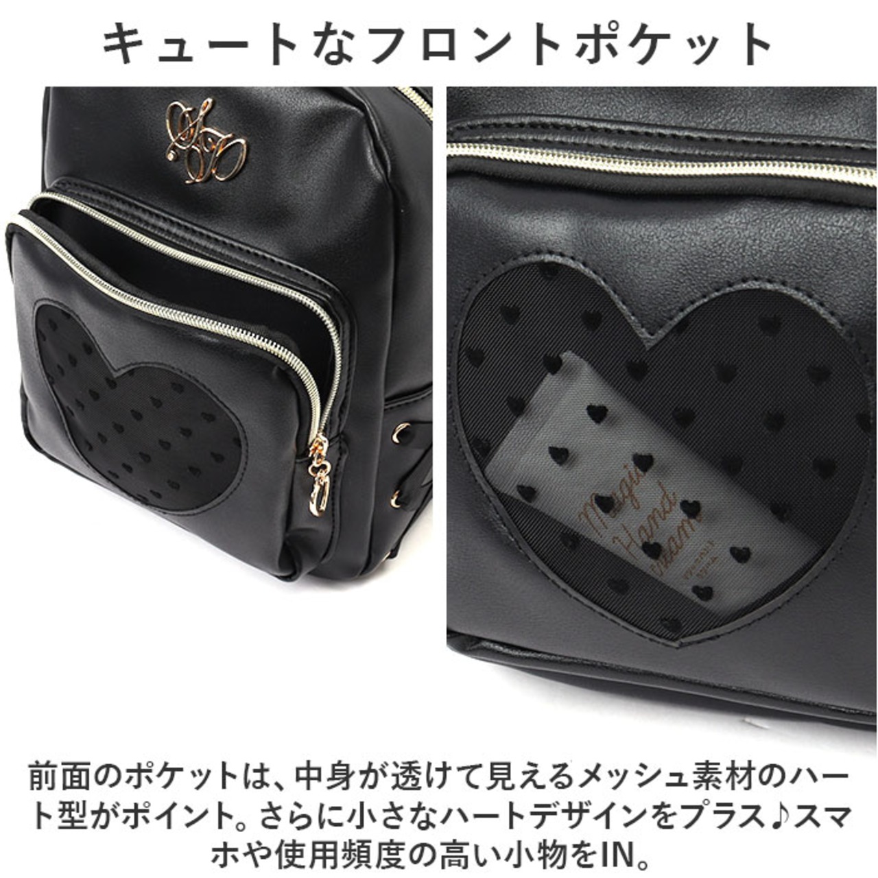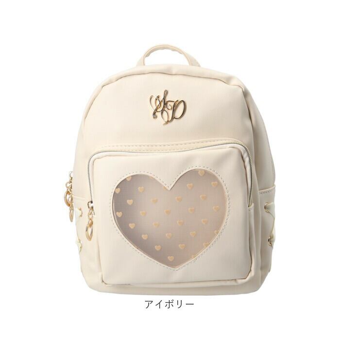 ・前面のポケットは、中身が透けて見えるメッシュ素材のハート型がポイント。さらに小さなハートデザインをプラス♪スマホや使用頻度の高い小物をIN。
