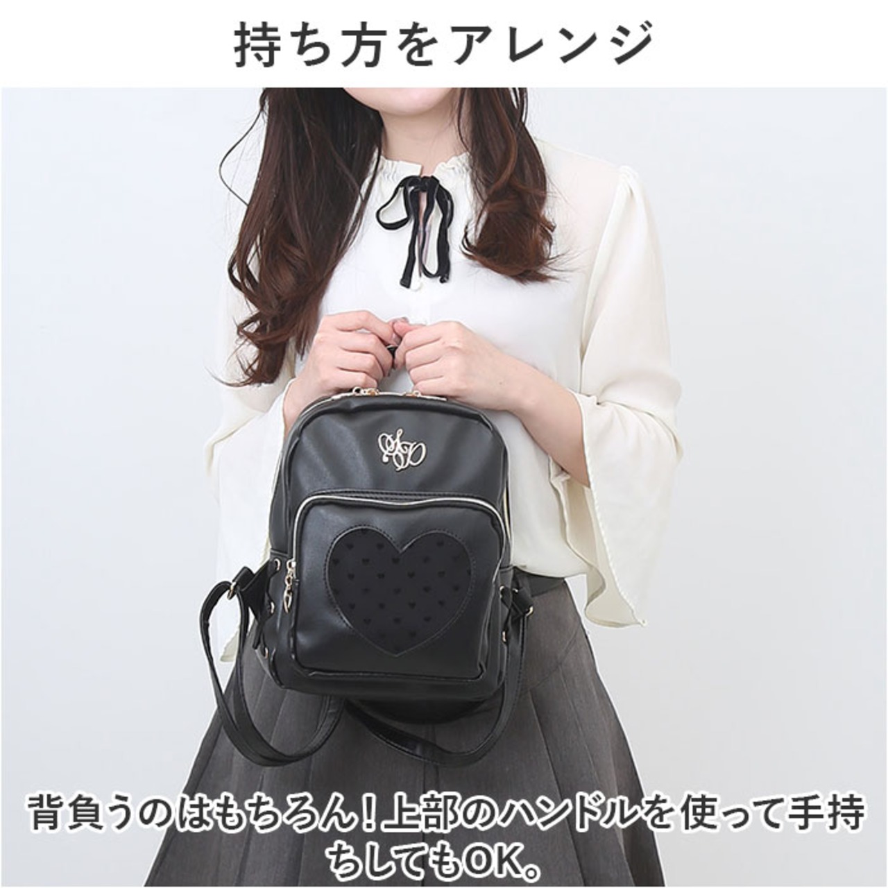・フロントの立体的なモチーフや、一部がハート型にデザインされたポケット、サイドのクロスリボンなど、細部まで抜かりないこだわりがいっぱい♪引き手もハート型にデザイン。