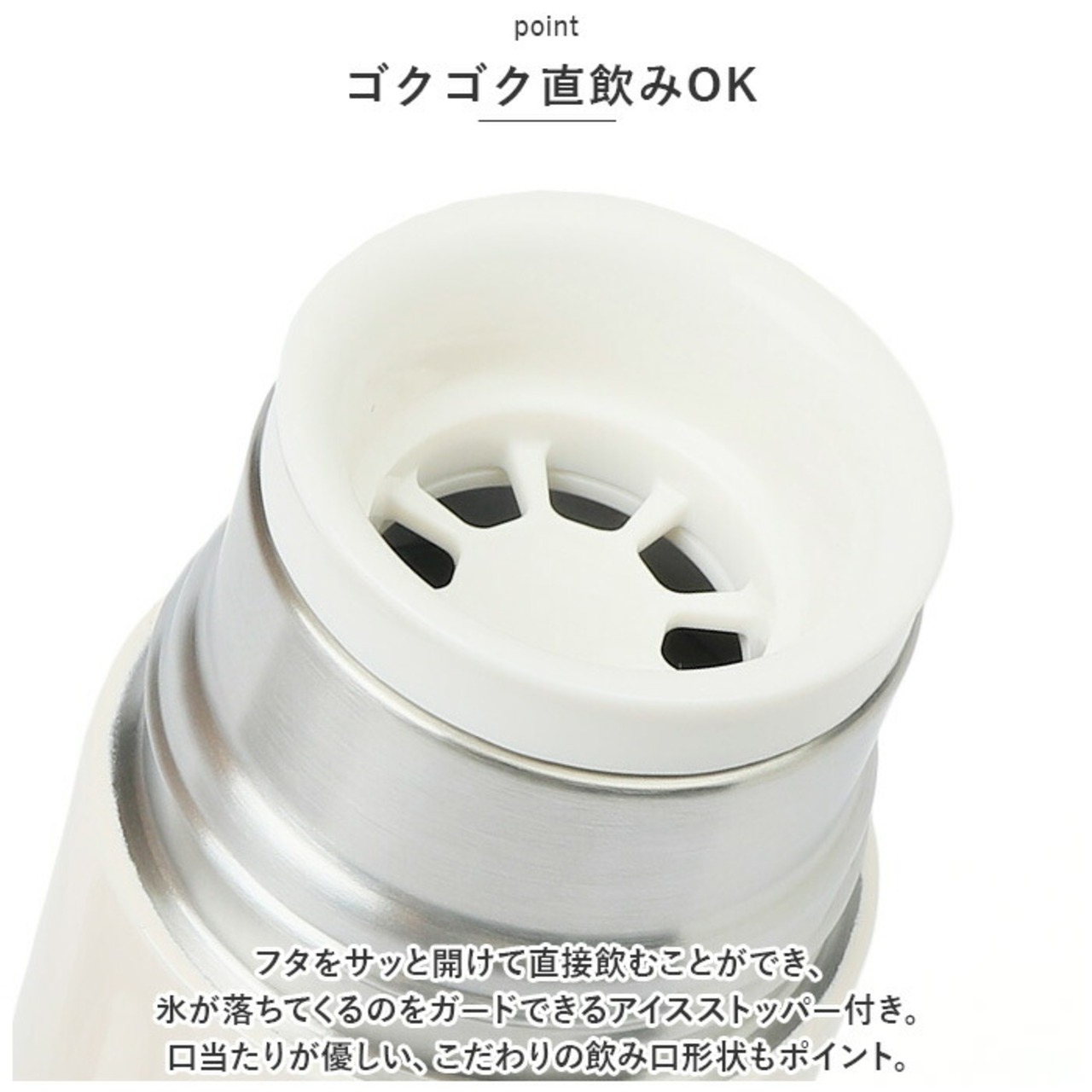 ・フタをサッと開けて直接飲むことができ、氷が落ちてくるのをガードできるアイスストッパー付き。口当たりが優しい、こだわりの飲み口形状もポイント。