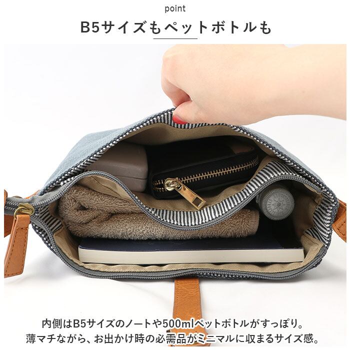 ・内側はB5サイズのノートや500mlペットボトルがすっぽり。薄マチながら、お出かけ時の必需品がミニマルに収まるサイズ感。