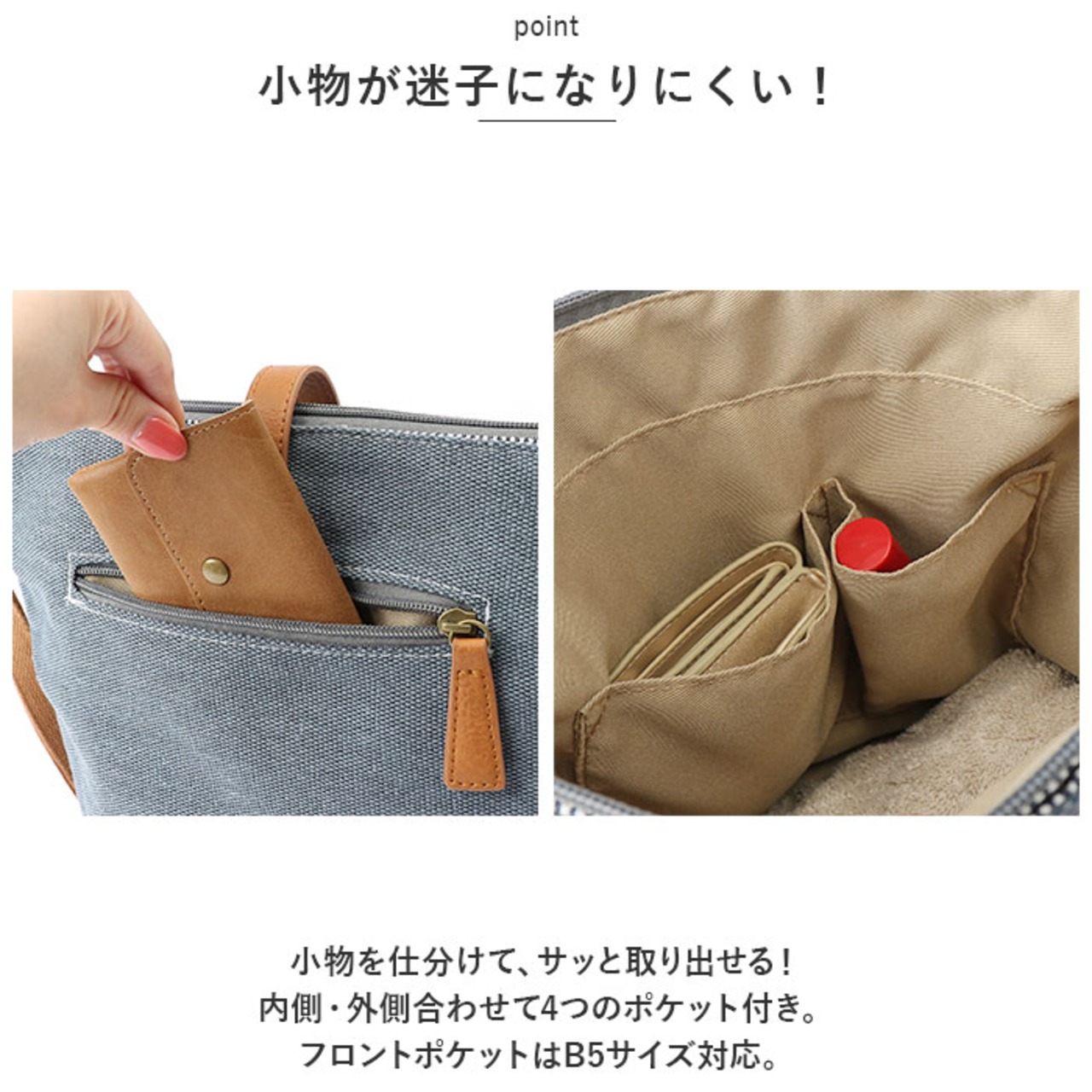 ・小物を仕分けて、サッと取り出せる!内側・外側合わせて4つのポケット付き。フロントポケットはB5サイズ対応。