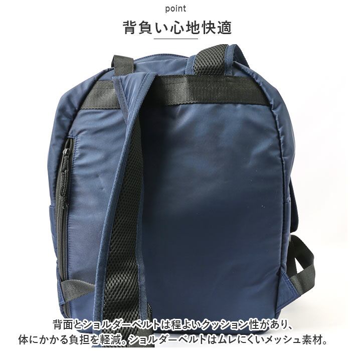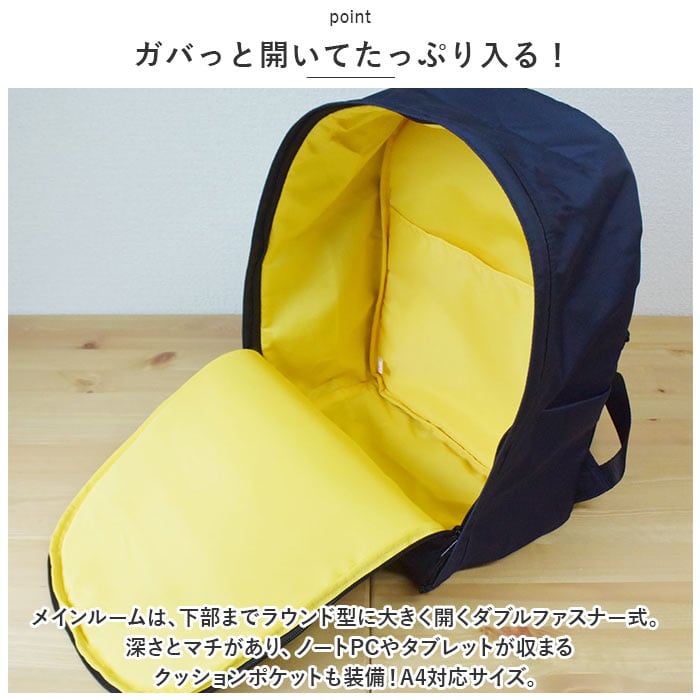 ・メインルームは、下部までラウンド型に大きく開くダブルファスナー式。深さとマチがあり、ノートPCやタブレットが収まるクッションポケットも装備!A4対応サイズ。