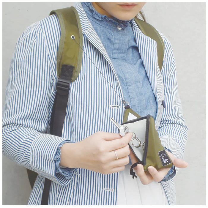 ・2つのポケットは最低限の現金やICカードを収納できて、キャッシュレス派にうれしいつくり。鍵を取り付けできるキーリング付き。