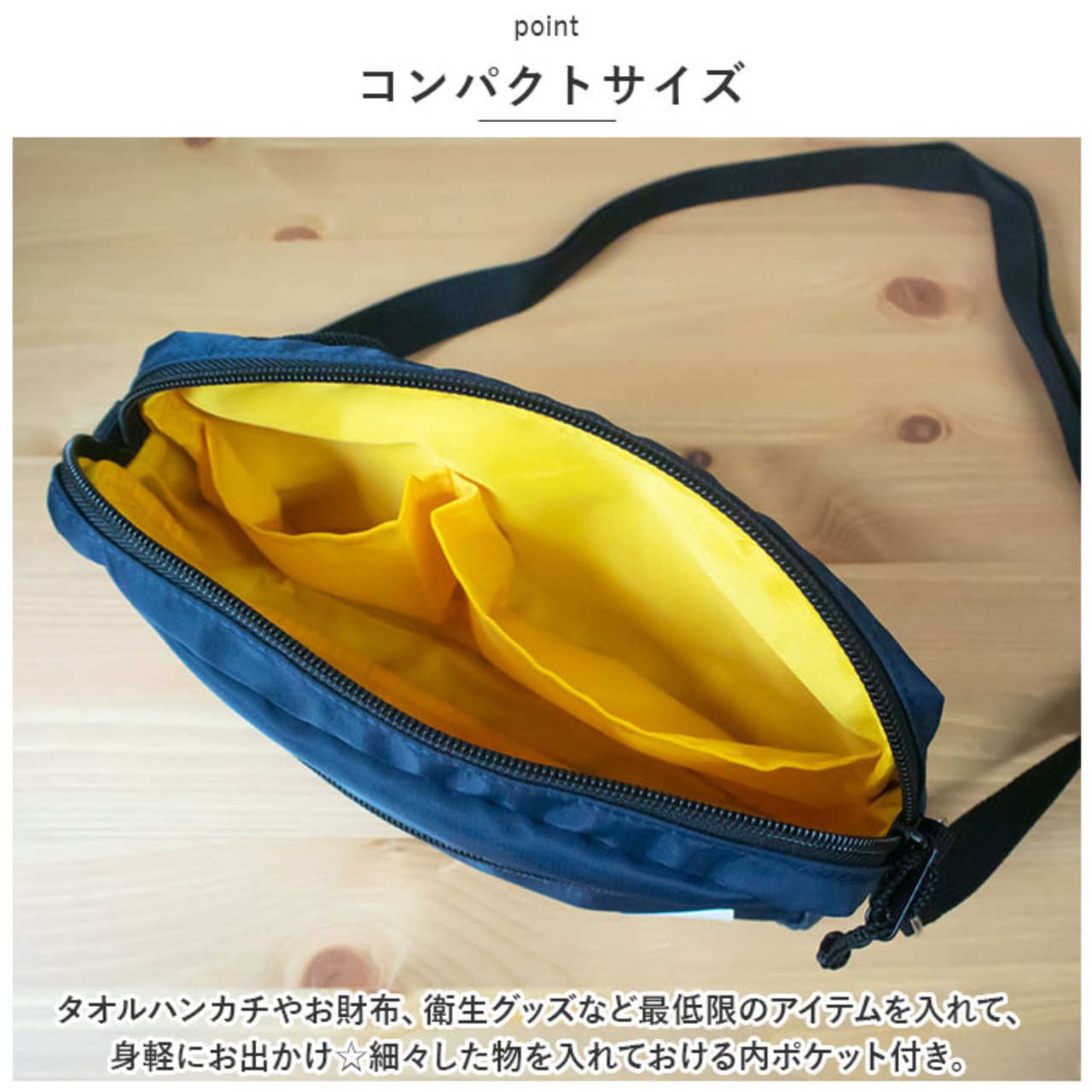 ・タオルハンカチやお財布、衛生グッズなど最低限のアイテムを入れて、身軽にお出かけ☆細々した物を入れておける内ポケット付き。