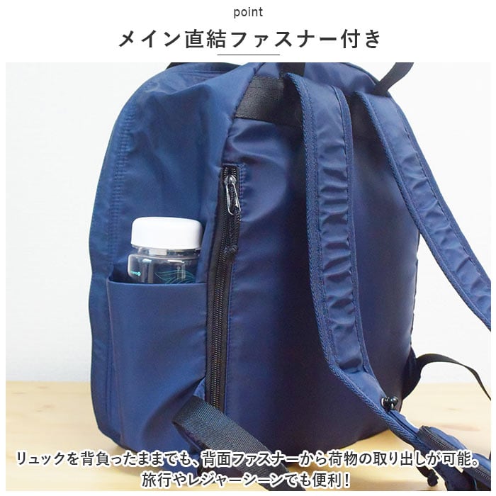 ・リュックを背負ったままでも、背面ファスナーから荷物の取り出しが可能。旅行やレジャーシーンでも便利!