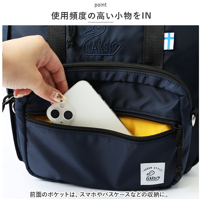 ・前面のポケットは、スマホやパスケースなどの収納に。