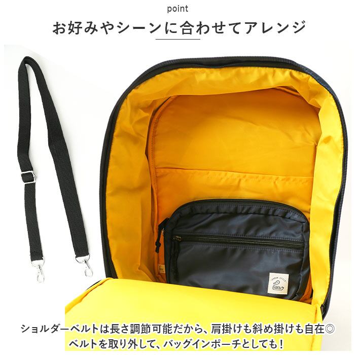 ・本体のバッグを手持ちで使うのはもちろん!フロントのポケット部分をスナップボタンループを外し、付属のショルダーベルトを取り付ければショルダーバッグに!