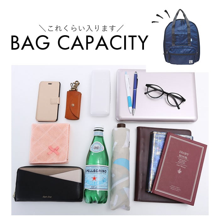 ・前面のファスナー式ミニポケットには細々した物をIN。サイドポケットには、ペットボトルや折りたたみ傘を安定した状態で収納可能。