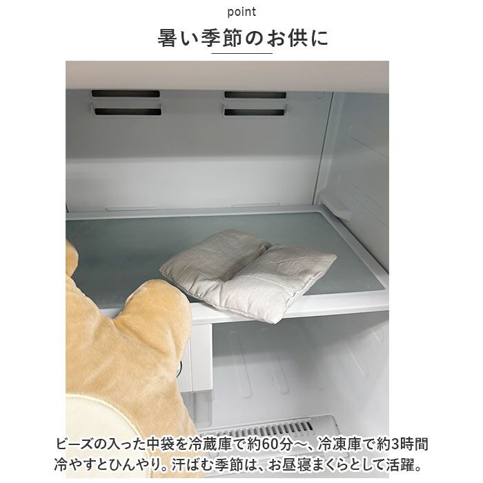 ・ビーズの入った中袋を冷蔵庫で約60分~、冷凍庫で約3時間冷やすとひんやり。汗ばむ季節は、お昼寝まくらとして活躍。