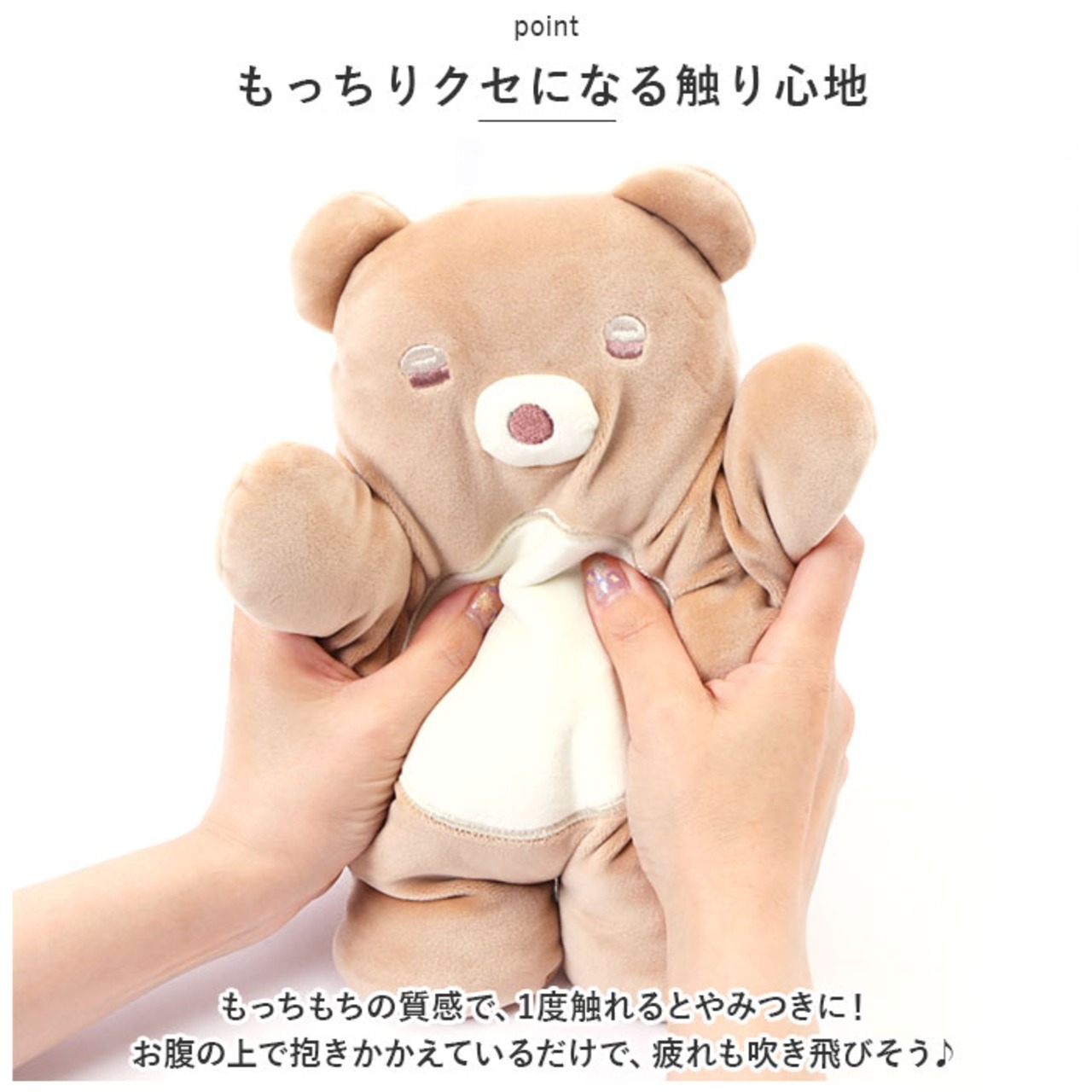 ・もっちもちの質感で、1度触れるとやみつきに!お腹の上で抱きかかえているだけで、疲れも吹き飛びそう♪