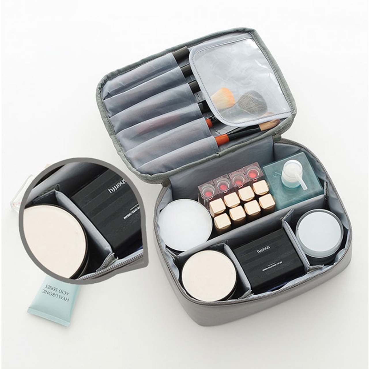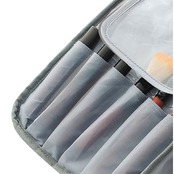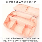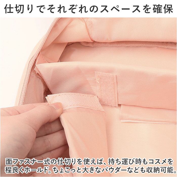 ・面ファスナー式の仕切りを使えば、持ち運び時もコスメを程良くホールド。ちょこっと大きなパウダーなども収納可能。