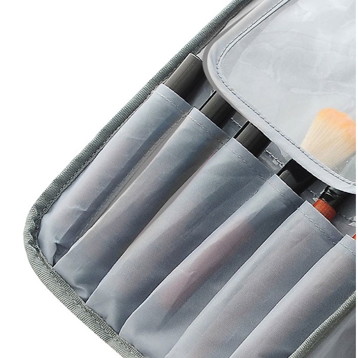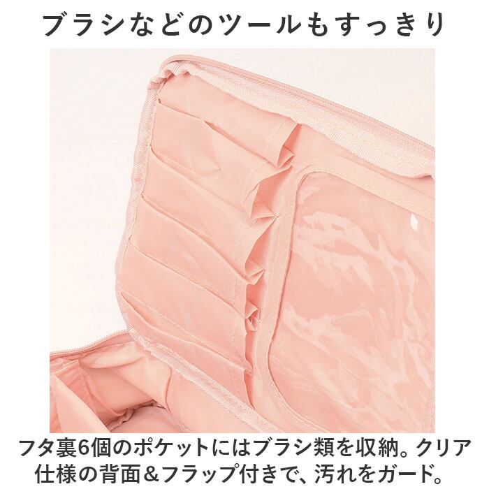・フタ裏6個のポケットにはブラシ類を収納。クリア仕様の背面&フラップ付きで、汚れをガード。