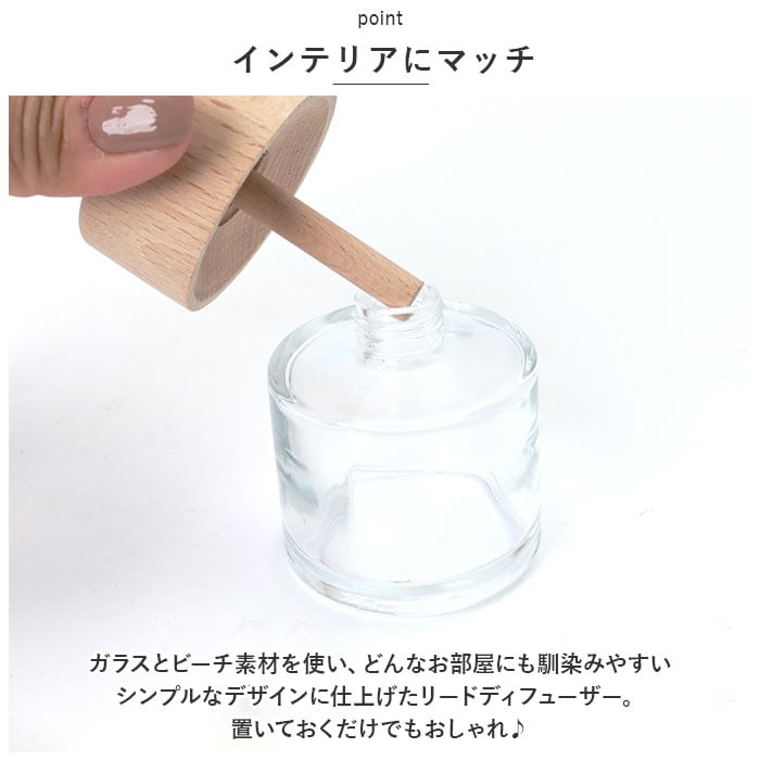 ・ガラスとビーチ素材を使い、どんなお部屋にも馴染みやすいシンプルなデザインに仕上げたリードディフューザー。置いておくだけでもおしゃれ♪