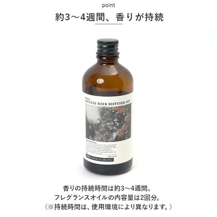 ・香りの持続時間は約3~4週間。フレグランスオイルの内容量は2回分。(※持続時間は、使用環境により異なります。)