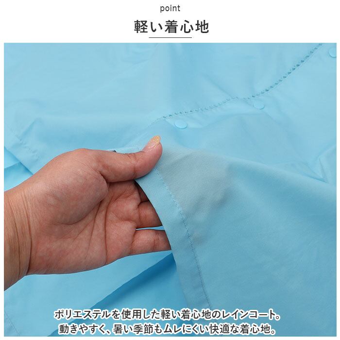 ・ポリエステルを使用した軽い着心地のレインコート。動きやすく、暑い季節もムレにくい快適な着心地。
