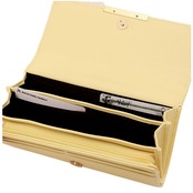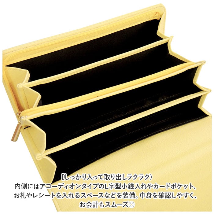 ・内側にはアコーディオンタイプのL字型小銭入れやカードポケット、お札やレシートを入れるスペースなどを装備。中身を確認しやすく、お会計もスムーズ◎