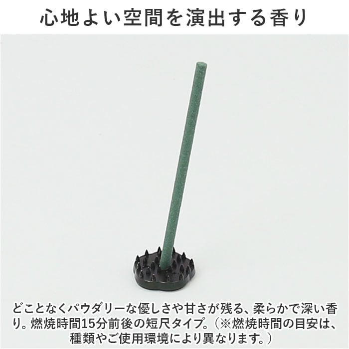 ・どことなくパウダリーな優しさや甘さが残る、柔らかで深い香り。燃焼時間15分前後の短尺タイプ。(※燃焼時間の目安は、種類やご使用環境により異なります。)