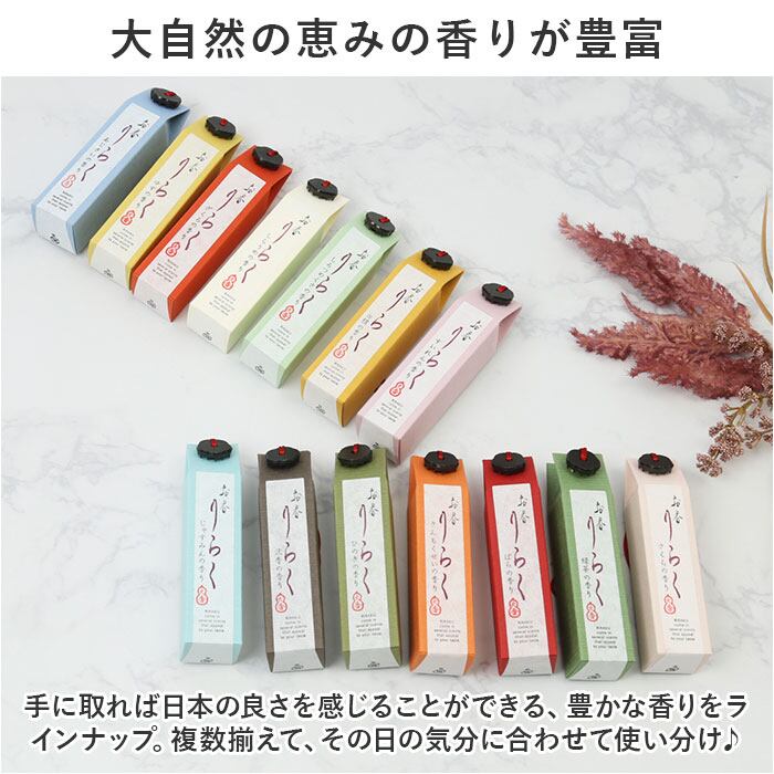 ・大自然の恵みを封じ込めた和の香り♪色とりどりの小箱の中に、多彩な香りを詰めた「りらく」のお香が新登場。