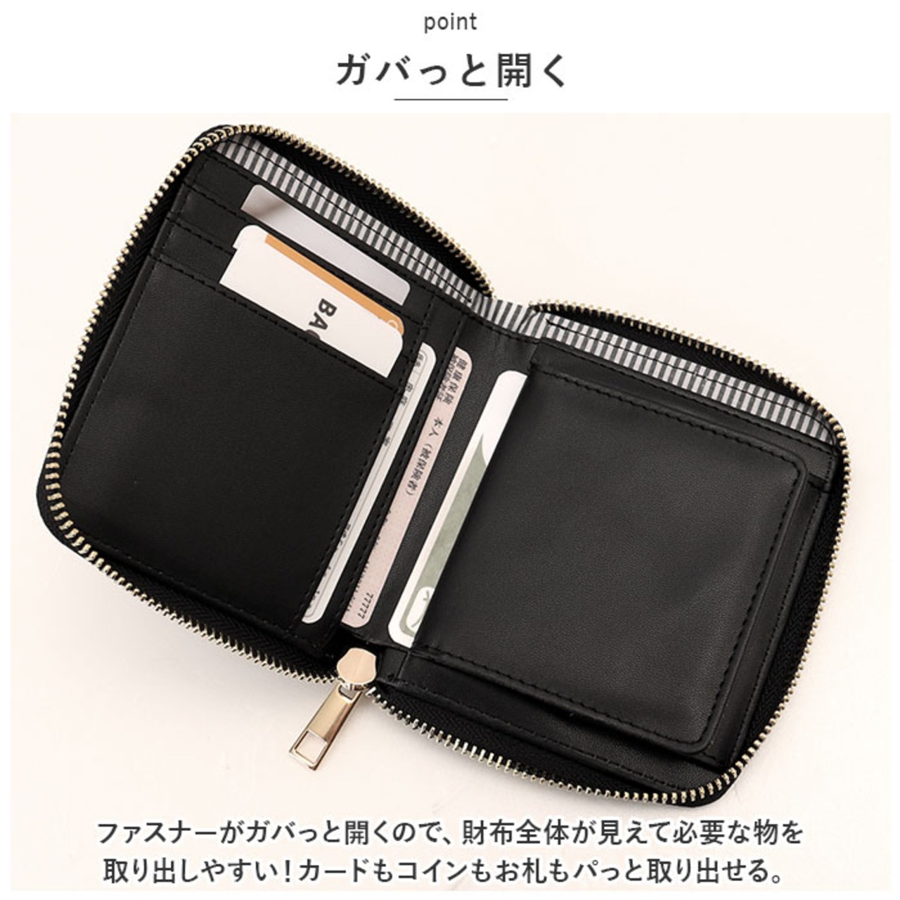 ・ファスナーがガバっと開くので、財布全体が見えて必要な物を取り出しやすい!カードもコインもお札もパっと取り出せる。