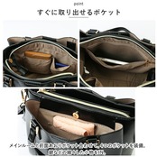 ・手持ちのハンドバッグとしてはもちろん、長さ調節可能なショルダーベルトを取り付けて、肩掛けや斜め掛けもOK!