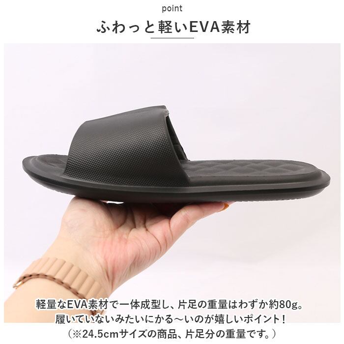 ・軽量なEVA素材で一体成型し、片足の重量はわずか約80g。履いていないみたいにかる~いのが嬉しいポイント!(※24.5cmサイズの商品、片足分の重量です。)