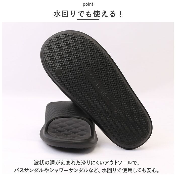 ・波状の溝が刻まれた滑りにくいアウトソールで、バスサンダルやシャワーサンダルなど、水回りで使用しても安心。