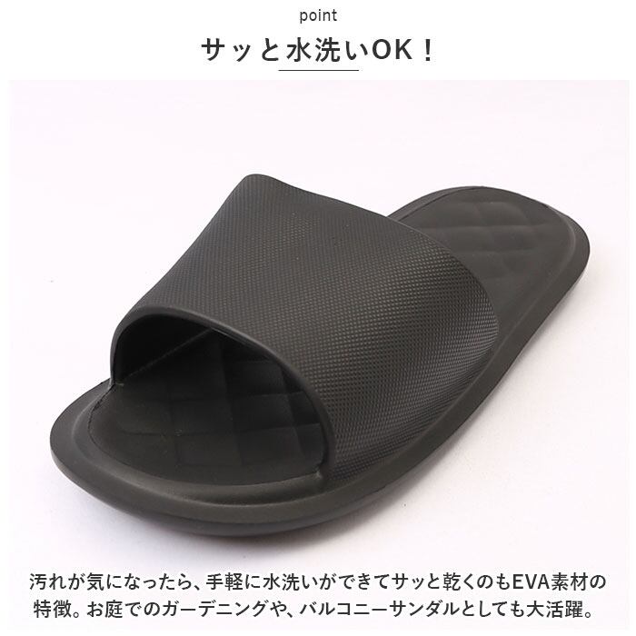 ・汚れが気になったら、手軽に水洗いができてサッと乾くのもEVA素材の特徴。お庭でのガーデニングや、バルコニーサンダルとしても大活躍。