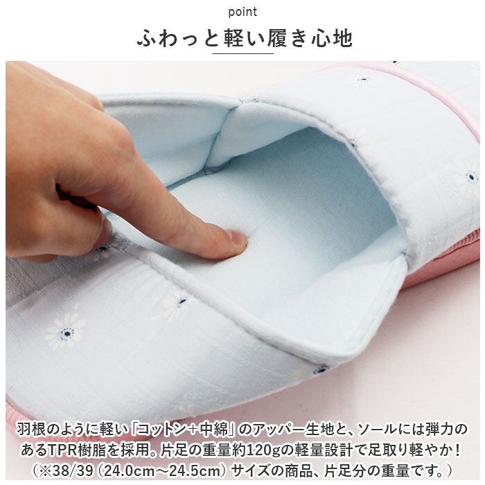 ・羽根のように軽い「コットン+中綿」のアッパー生地と、ソールには弾力のあるTPR樹脂を採用。片足の重量約120gの軽量設計で足取り軽やか!(※38/39(24.0cm~24.5cm)サイズの商品、片足分の重量です。)