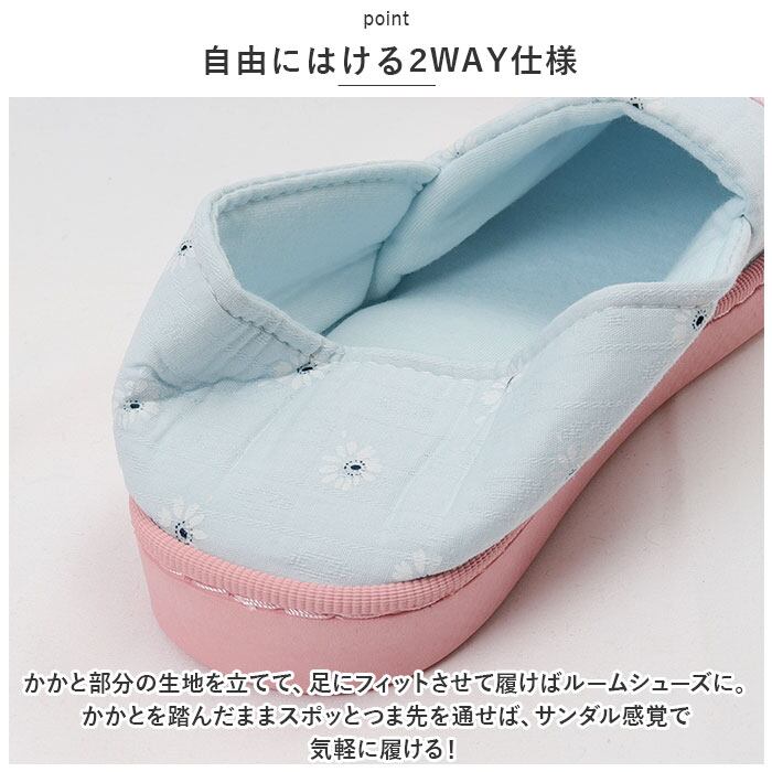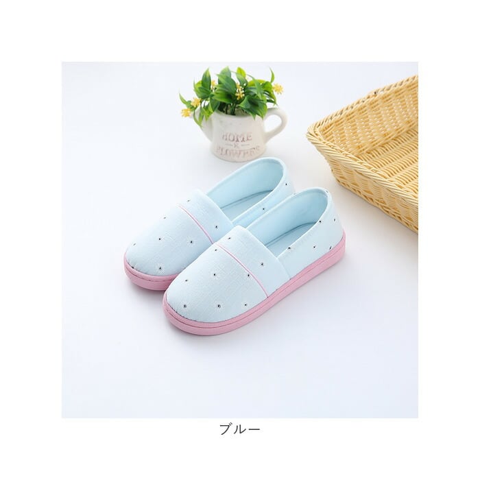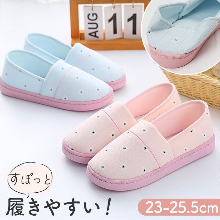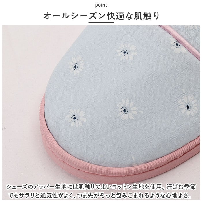 ・パステルカラーの生地に可憐な小花を散らした、足元がパッと華やぐカラーリングが好印象。ルームシューズや介護シューズとしてはもちろん、オフィス用シューズにもオススメ。
