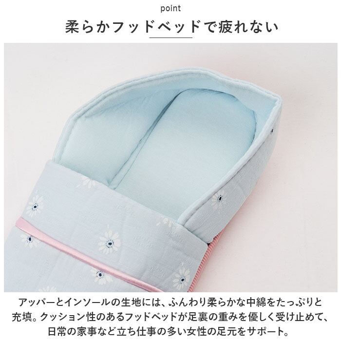 ・アッパーとインソールの生地には、ふんわり柔らかな中綿をたっぷりと充填。クッション性のあるフッドベッドが足裏の重みを優しく受け止めて、日常の家事など立ち仕事の多い女性の足元をサポート。