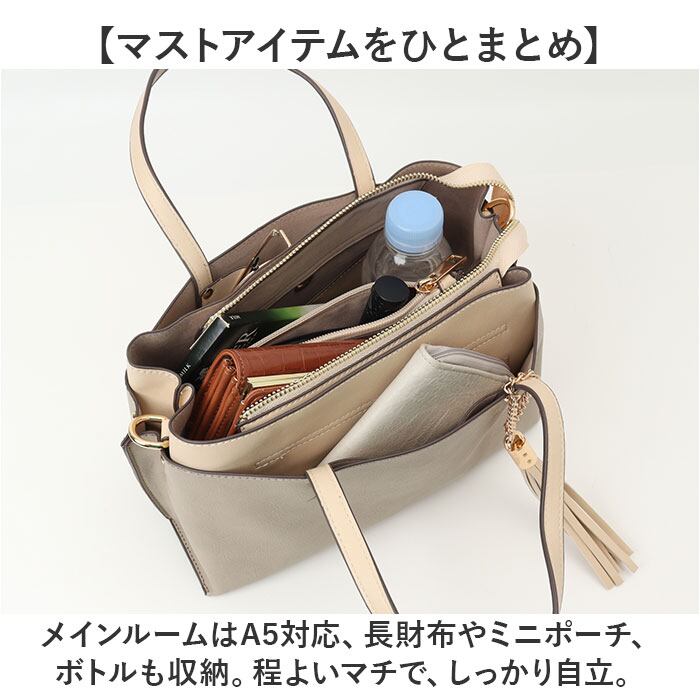 ・メインルームはA5対応、長財布やミニポーチ、ボトルも収納。程よいマチで、しっかり自立。