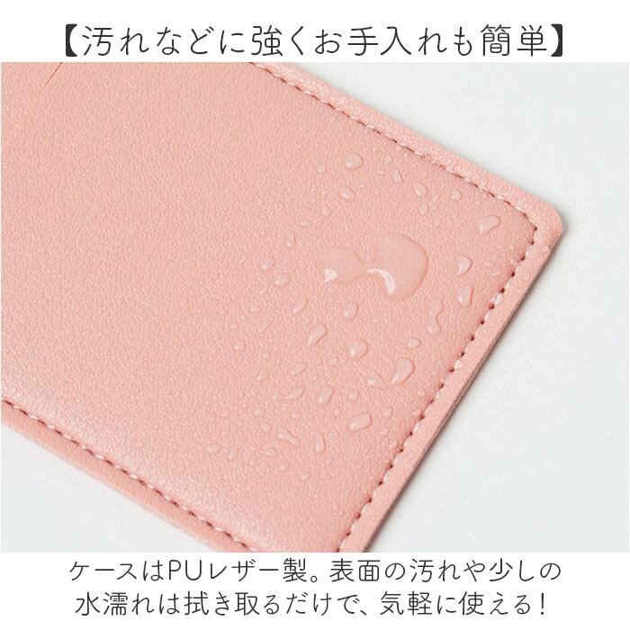 ・ケースはPUレザー製。表面の汚れや少しの水濡れは拭き取るだけで、気軽に使える!