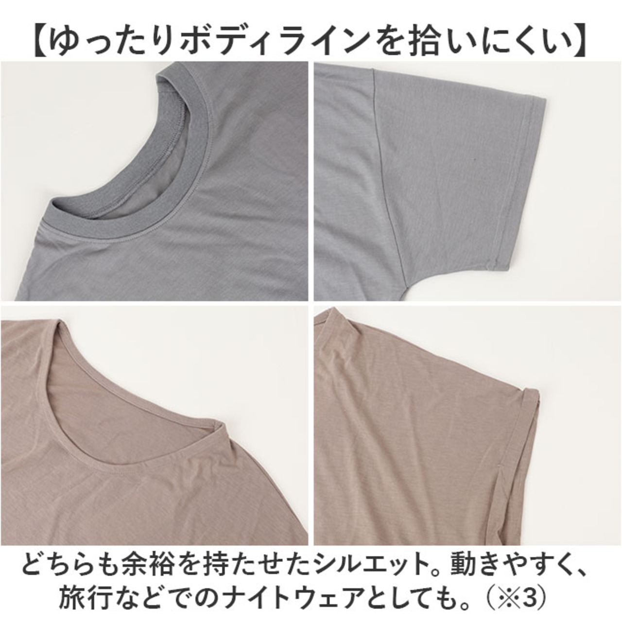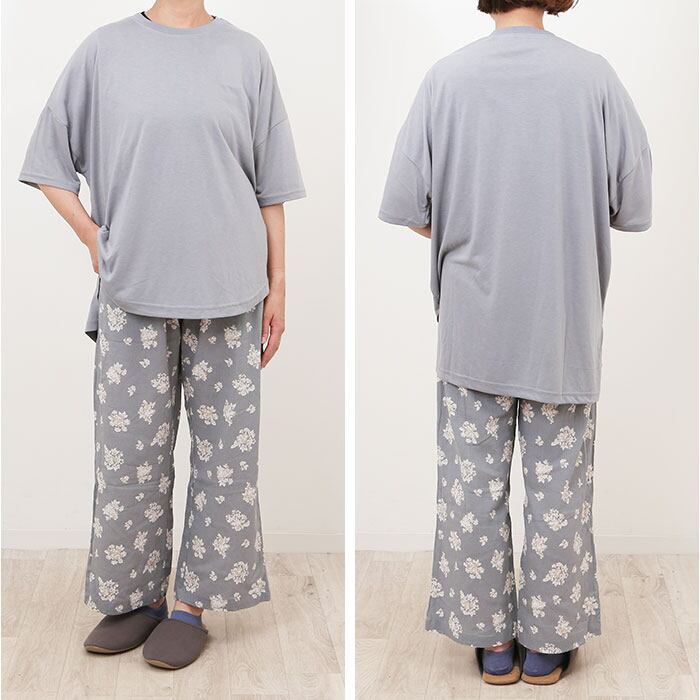 ・どちらも余裕を持たせたシルエット。動きやすく、旅行などでのナイトウェアとしても。