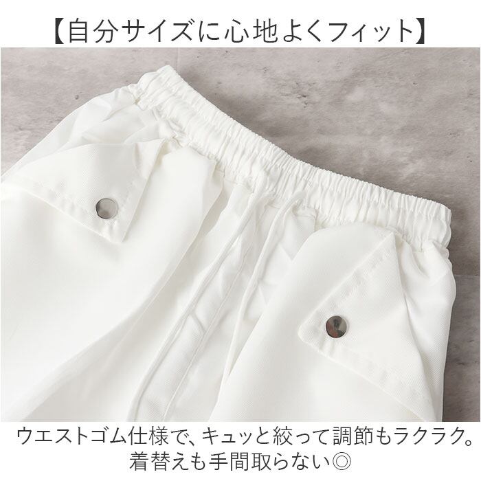 ・ウエストゴム仕様で、キュッと絞って調節もラクラク。着替えも手間取らない◎