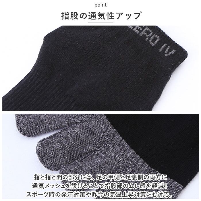 ・指と指と間の部分には、足の甲側と足裏側の両方に通気メッシュを設けることで指股部のムレ感を軽減!スポーツ時の発汗対策や昨今の気温上昇対策にも対応。