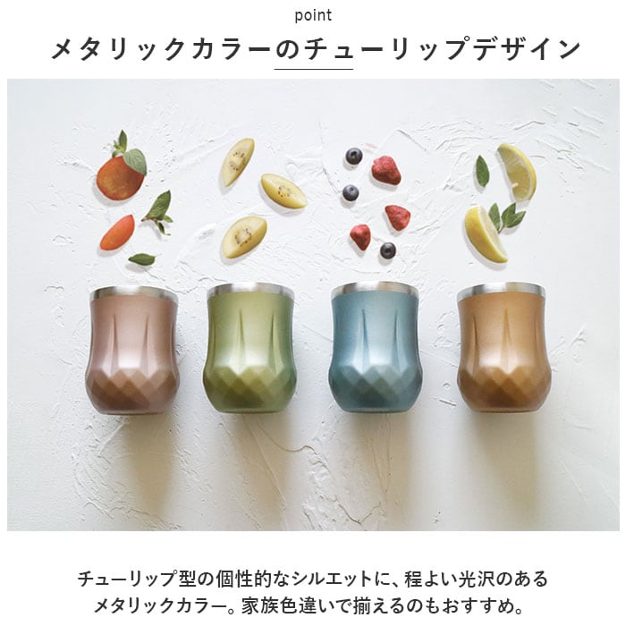 ・チューリップ型の個性的なシルエットに、程よい光沢のあるメタリックカラー。家族色違いで揃えるのもおすすめ。