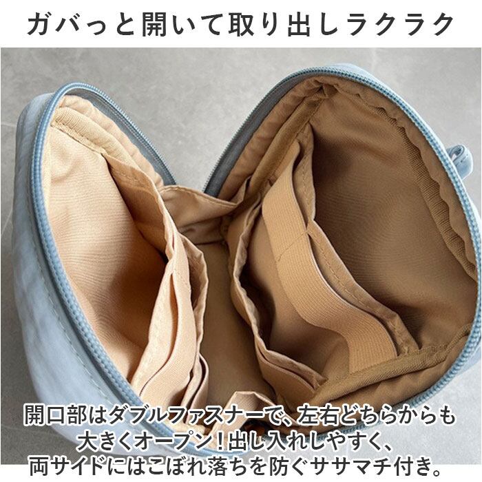 ・開口部はダブルファスナーで、左右どちらからも大きくオープン!出し入れしやすく、両サイドにはこぼれ落ちを防ぐササマチ付き。