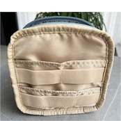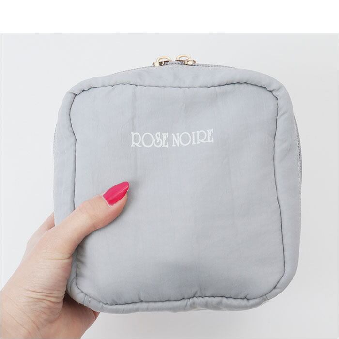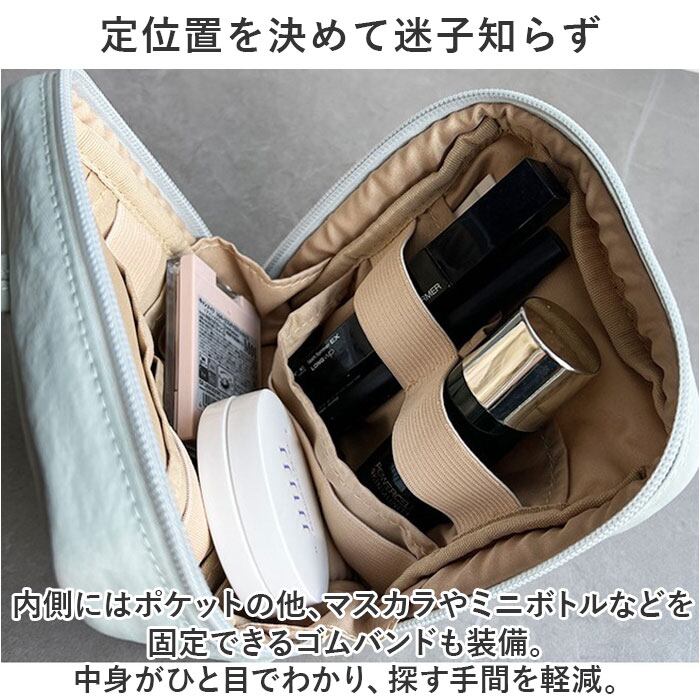 ・内側にはポケットの他、マスカラやミニボトルなどを固定できるゴムバンドも装備。中身がひと目でわかり、探す手間を軽減。