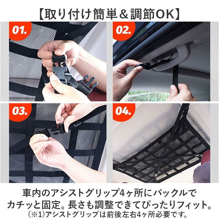 ・車内のアシストグリップ4ヶ所にバックルでカチッと固定。長さも調整できてぴったりフィット。