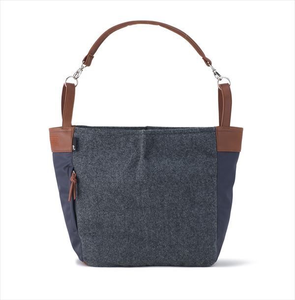 ウール混の生地と光沢ポリエステルの異なる素材をコンビにした、2通りの持ち方のできるトートバッグです。