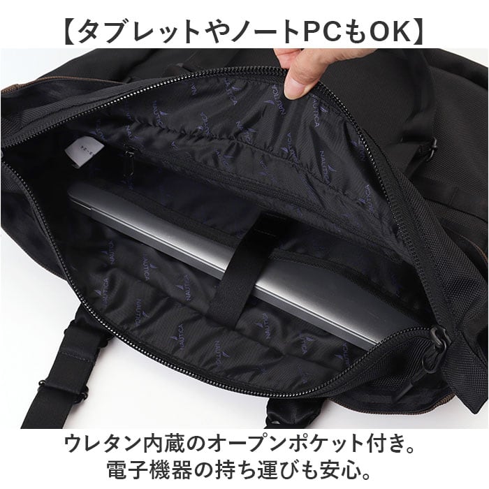 ・ウレタン内蔵のオープンポケット付き。電子機器の持ち運びも安心。